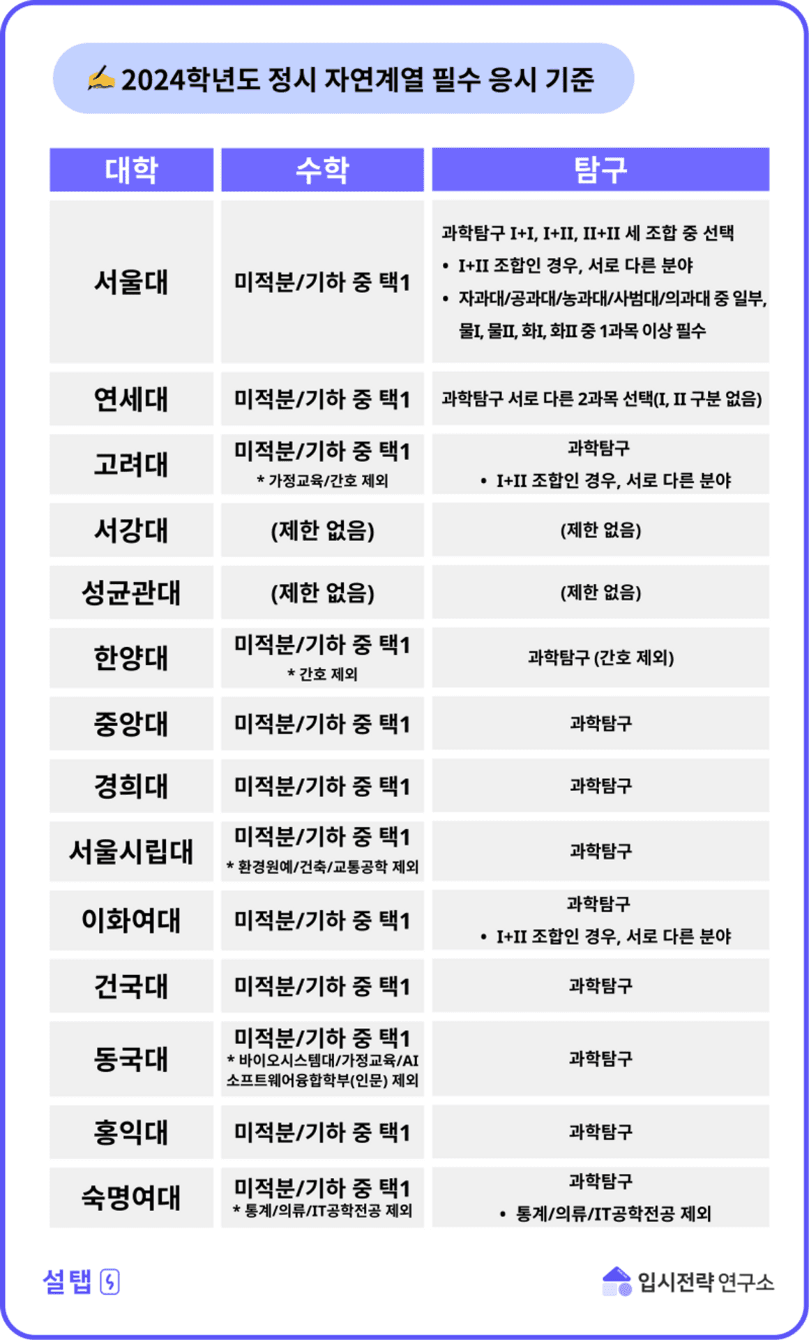 다음은 2024년 서울 주요 대학 14곳을 중심으로, 2024년 자연계열 수능 필수 과목을 소개하겠습니다.
