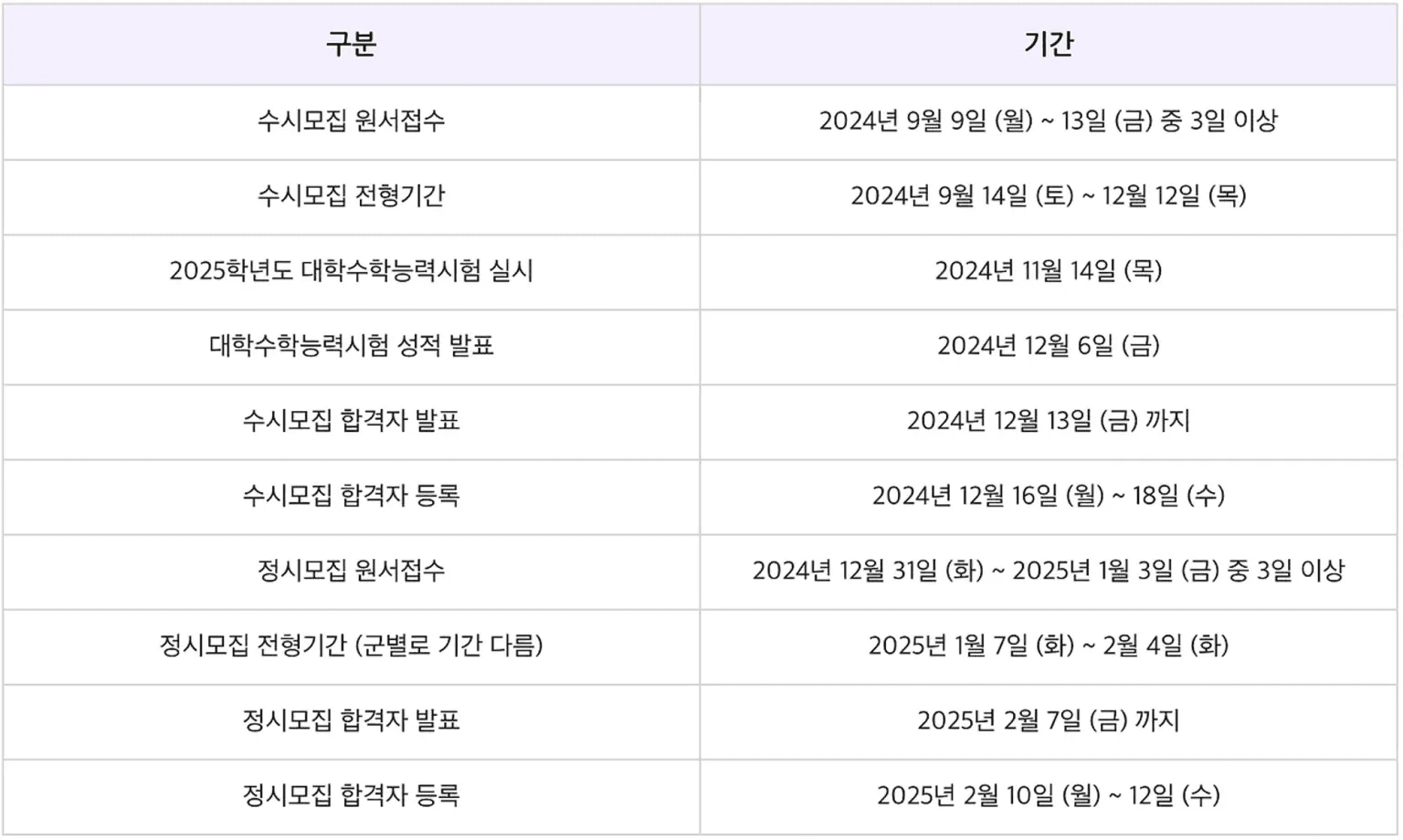 2025학년도 대입일정을 표를 통해 확인하고, 새 학기를 맞아 1년 계획을 구체적으로 세워보면 어떨까요?