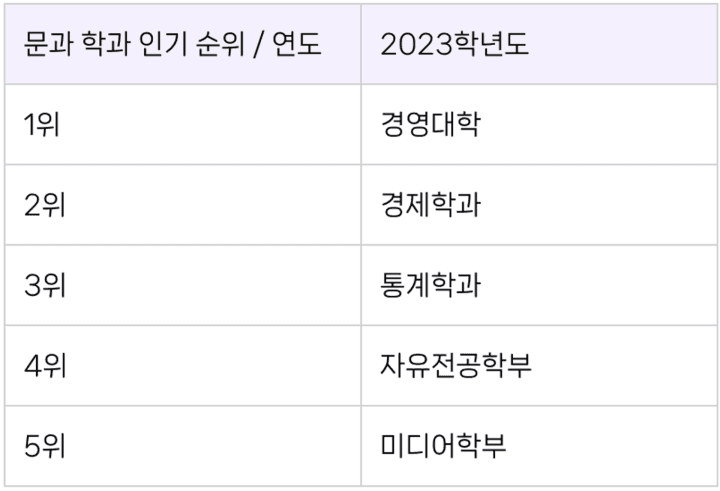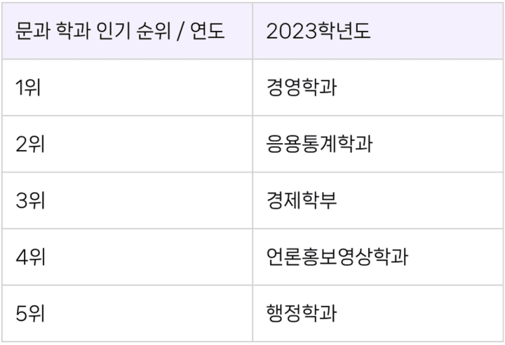 마지막으로 고려대 또한 인문계의 경우 1964년부터 2023년까지 쭉 경영대학이 인기학과 1위를 차지하고 있어요. 2023년도만 보았을 때 2위는 경제,