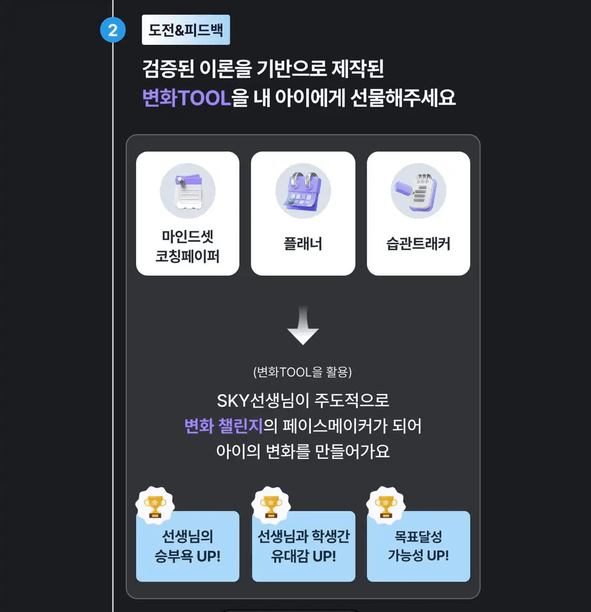 SKY 출신 멘토 선생님과 함께 학습 계획을 세우고, 꾸준히 실천하며 작은 성취감을 쌓아가다 보면 아이들은 공부의 즐거움을 느끼게 될 거예요. 이 과정을 통해 단기적이 아닌, 장기적이며 진정한 변화를 만들어갈 수 있답니다.