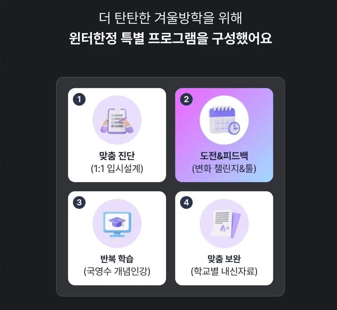 하지만 겨울방학 특강이 모든 학생에게 적합한 방법은 아니에요. 대부분의 특강은 상위권 학생들을 대상으로 설계되어 있어, 기본기가 부족하거나 공부 습관이 잡혀 있지 않은 학생들에게는 오히려 부담이 될 수 있어요. 수준에 맞지 않는 너무 어려운 수업은 아이들에게 좌절감을 줄 수 있고, 공부에 대한 흥미를 잃게 만들기도 하죠.