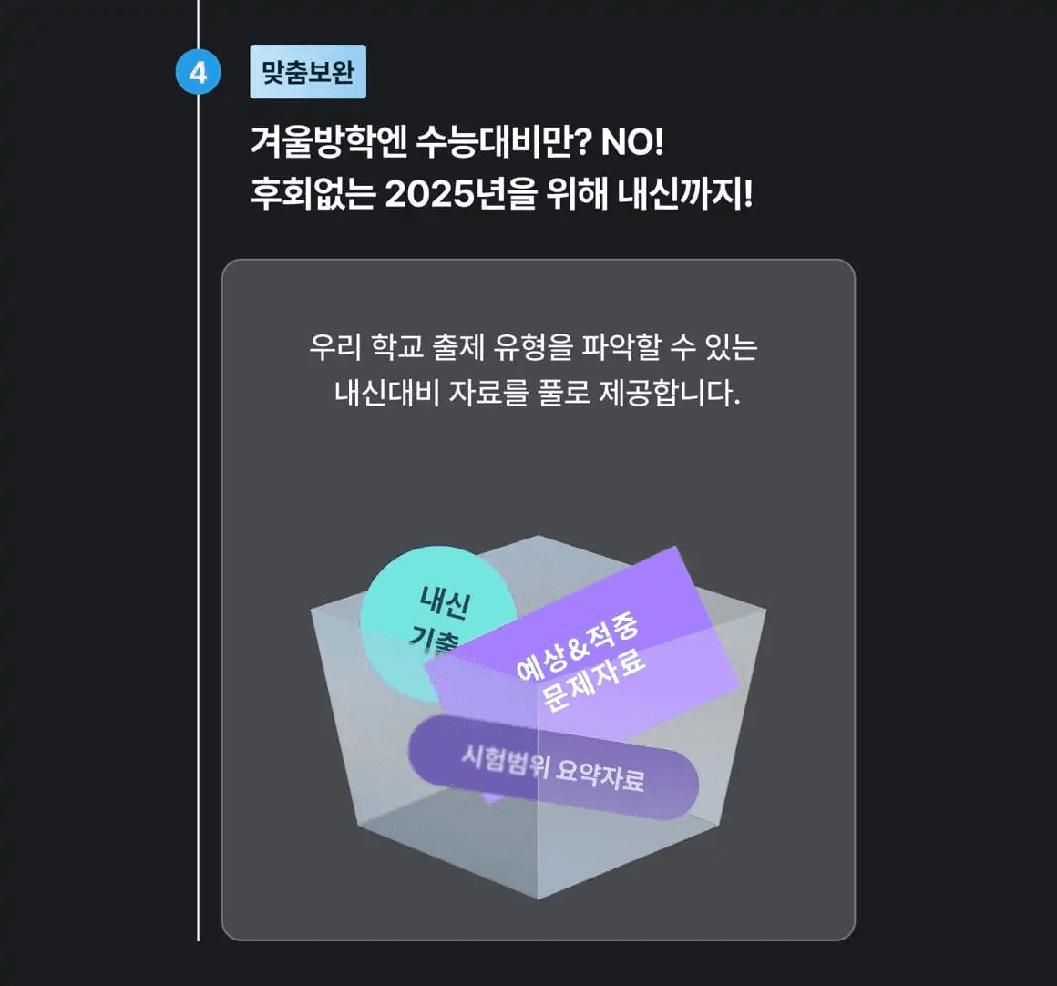 설탭 윈터과외는 겨울방학이라고 해서 모의고사 대비에만 집중하지 않아요. 학교별 내신 자료를 활용해 학생들이 내신 시험도 빈틈없이 대비할 수 있도록 도와주죠.