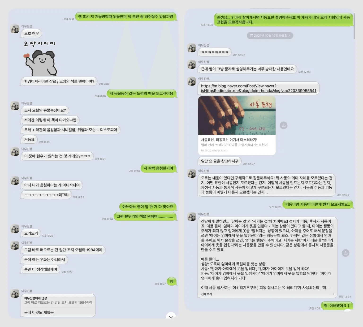 고1 때 국어 모의고사 5등급이었으니 얼마나 부족했겠어요. 그런데 쌤이 처음부터 어려운 문제집을 주셨어요. 3학년이 보는 책이었죠. 정말 복잡한 지문은 일주일 내내 본적도 있어요. 그때 좀 괴로웠지만 오기가 생겨서 학교에서 짬 날 때마다 그 문제를 계속 봤어요. 쌤이 얘기하는 근거가 무엇인지 생각하면서 종이에 써보기도 하고, 모르는 단어는 찾아보기도 하면서요.