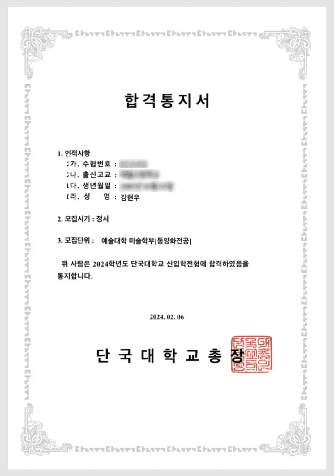 그렇게 3주를 수능 국어 공부로 불태운 결과 현우는 국어 3등급을 받았고 정시 전형으로 순수 미술계 역사와 전통을 지닌 것으로 잘 알려진 단국대 예술대학에 성적우수 장학금을 받고 입학하게 됐어요.