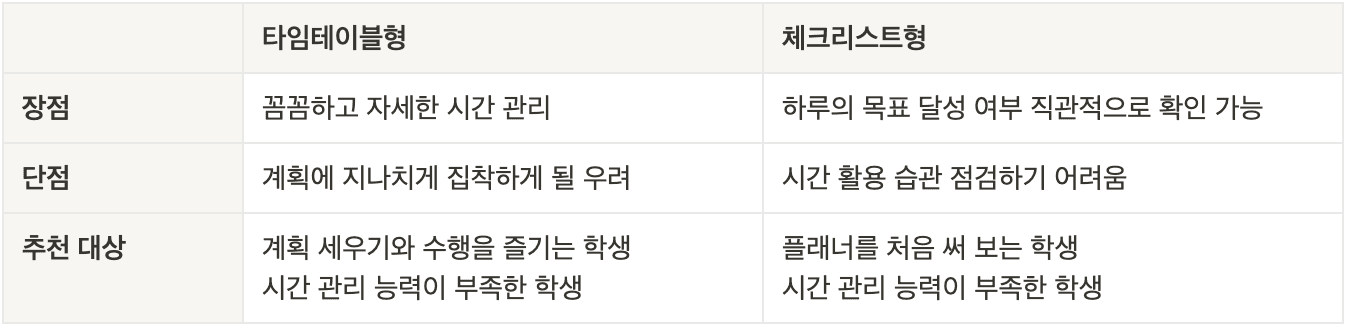 여러분이 흔히 알고 있을 모O모O 사의 플래너를 떠올리면 이해가 쉬울 거예요. 타임테이블형 플래너는 분 단위의 꼼꼼하고 자세한 시간 관리가 가능하다는 장점이 있지만, 계획에 지나치게 집착하게 해 오히려 능률을 떨어뜨릴 우려도 있습니다. 따라서 계획을 세우고 차근차근 수행하는 걸 즐기는 학생이나 시간 관리 능력을 보완하고 싶은 학생에게 추천합니다.