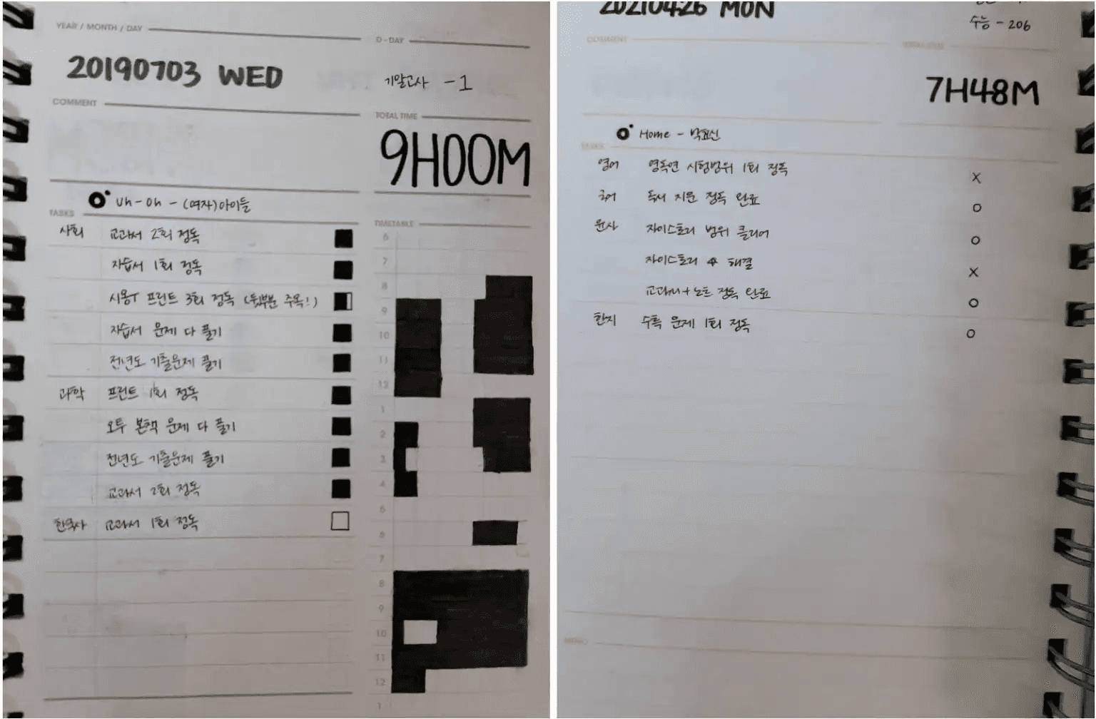 타임테이블형 플래너(좌)와 체크리스트형 플래너(우)의 예시. 멘토가 직접 활용한 사례입니다.