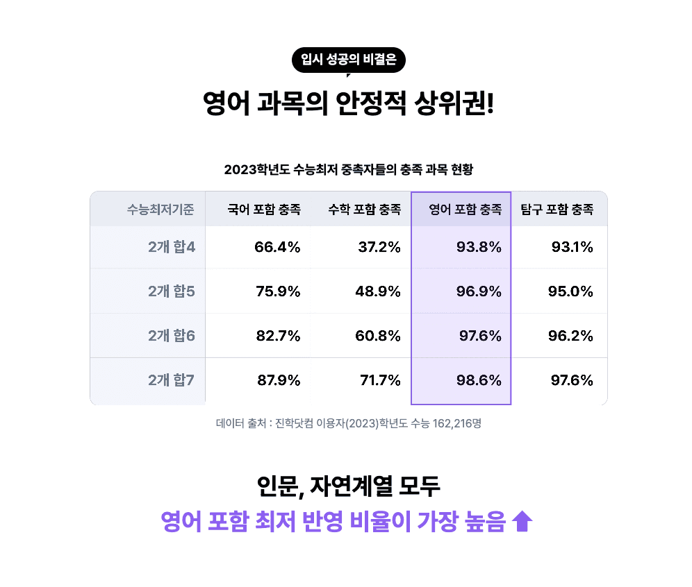 수능 영어는 절대평가 과목이라 다른 과목에 비해 부담이 적다고 느껴질 수 있어요. 하지만 수능 최저학력기준을 맞추는 데 영어가 결정적인 역할을 할 수 있다는 점에서 그 중요성을 간과해서는 안 돼요. 특히 수시 전형이나 논술 전형처럼 수능 최저를 요구하는 경우라면, 영어에서 안정적인 성적을 확보하는 것이 필수죠.