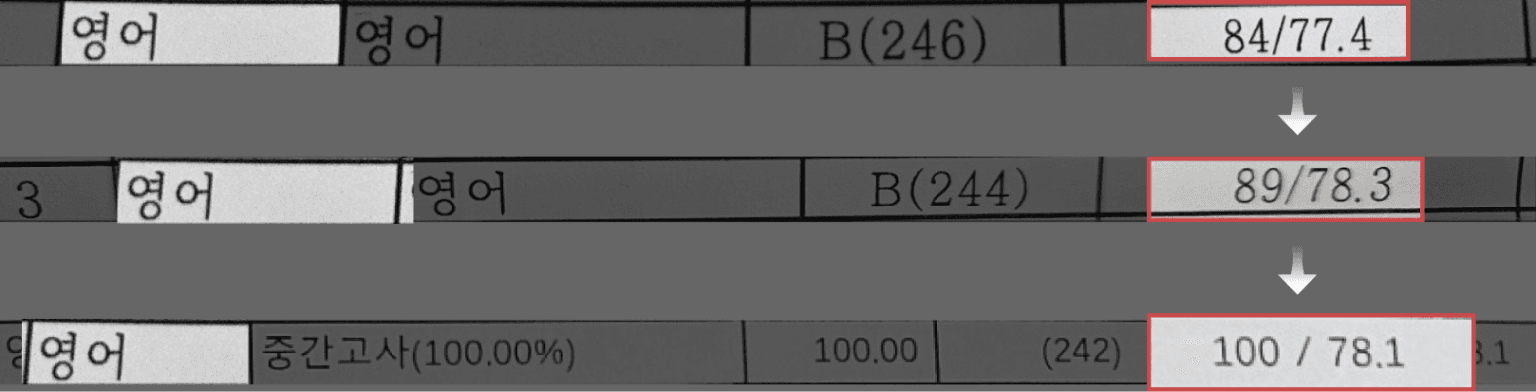 영어 84점으로 시작해 설탭 수업 이후 점수가 조금씩 오르더니 지난 중간고사엔 100점을 받았어요!