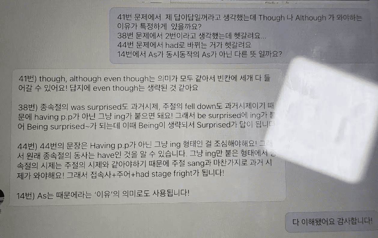 글로리아 | “문법에서는 항상 자신이 없었는데, 지윤 선생님과 공부하고 나서 문법과 영어에 대한 자신감이 많이 붙은 것 같아요. 100점을 맞는 건 그냥 희망 사항이라고 생각했는데, 그 희망 사항이 실제로 이뤄져서 기분이 정말 좋았고 또 선생님께서 진심으로 칭찬해 주셔서 더 기뻤어요. 제가 낯을 많이 가리는데, 선생님이 긴장을 풀 수 있도록 스몰토크도 해주시고 고양이 같은 관심사도 얘기해주시고(웃음)… 여러모로 다가가기 쉬운 선배님처럼 대해주셔서 진심으로 감사드려요.”