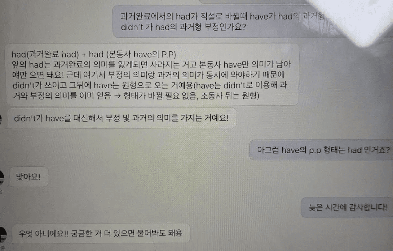 지윤 쌤 | “리아(글로리아와 친한 사람들은 글로리아를 ‘리아’라고 부른다)의 설탭 과외 신청서엔 ‘영어가 익숙하지만 문법에서 어려움을 느낀다’고 적혀 있었어요. 영어를 저보다 훨씬 유창하게 잘할 것 같았는데, 문법이 어렵다고 하니 제가 맡아서 단순한 반복 학습이 아니라 이해 중심의 수업으로 리아에게 꼭 맞는 방법으로 도움을 주고 싶었죠. 틀에 박힌 문법 공부를 강요하는 것이 아니라 이미 리아가 갖고 있는 뛰어난 독해 실력을 최대한 살려서 공부할 수 있도록 도와줘야겠다고 생각했어요.”