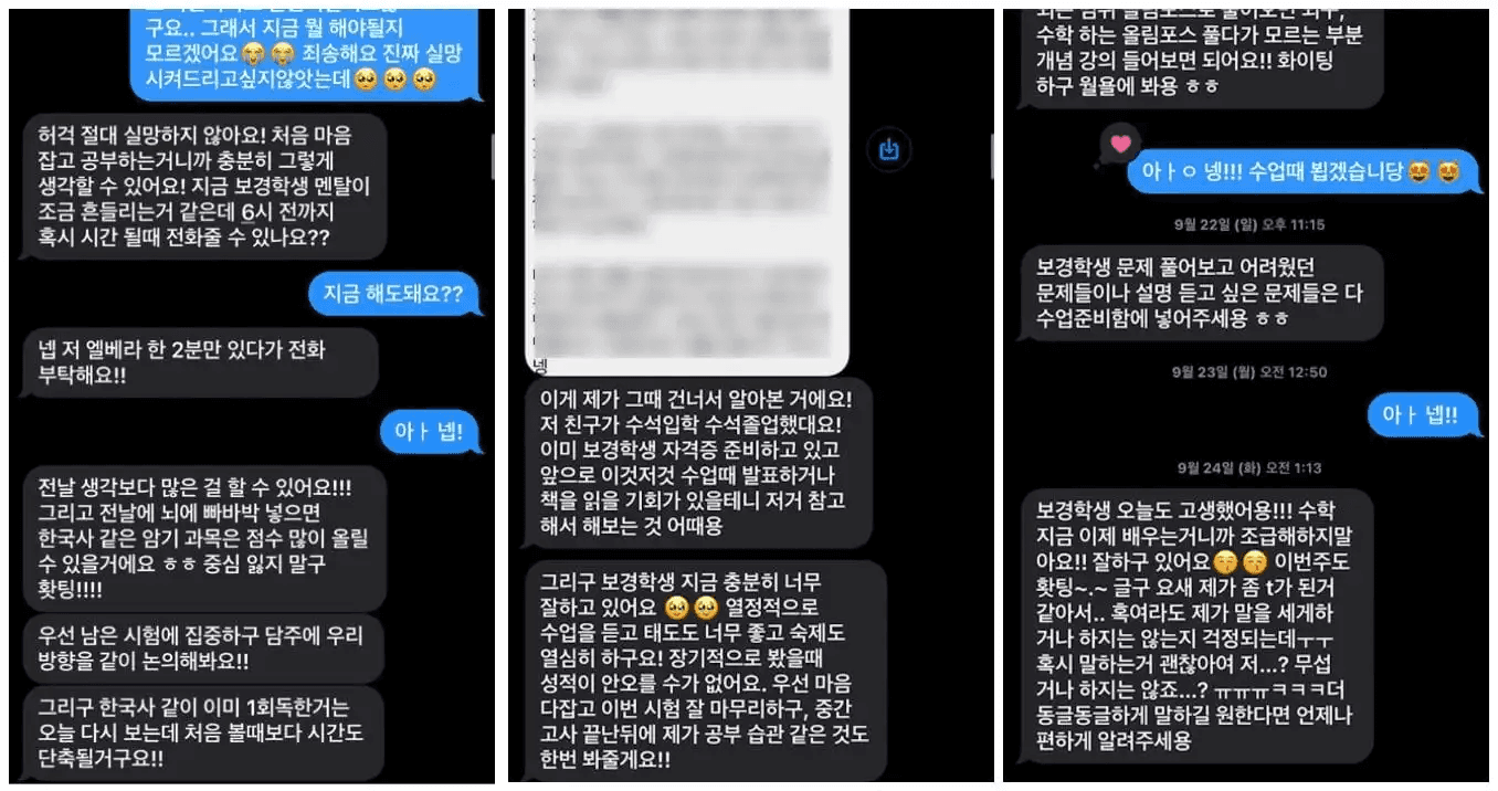 보경 | “심리적으로 흔들릴 때마다 선생님께 메시지를 드렸어요. 다른 애들은 선행도 엄청했을텐데, 저는 그게 아니니까 너무 불안하다고요. 그러면 선생님이 장문 메시지로 ‘일단 지금 할 수 있는 것에 최선을 다하고, 이번 시험 끝나고 어떻게 할지 제대로 이야기해 보자‘이런 식으로 제 마음을 이해해 주는 것처럼 답장해 주세요. 제 진로와 관련해서는 쌤이 주변 사람들에게도 방법을 물어봐 주시고, ‘실제로 이런 일이 있었다’고 말씀해 주셔서 멘탈을 잡는 데 정말 큰 도움이 되었어요.”