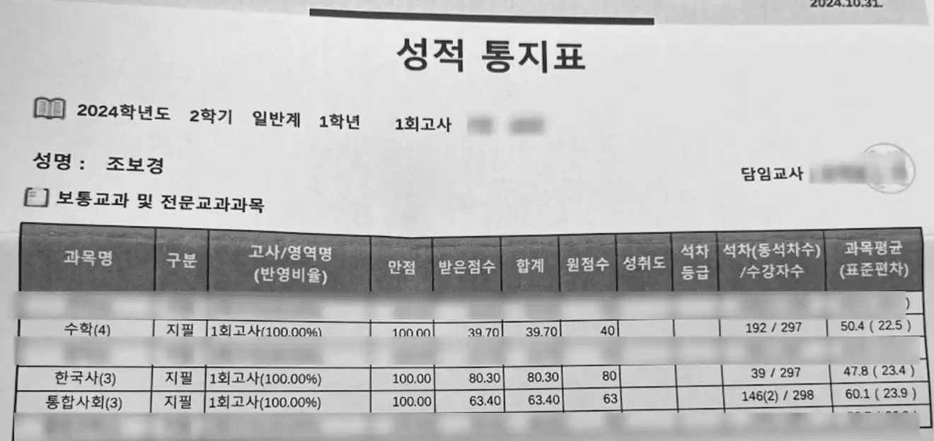 “316등 ☆ 전교생은 317명. 저의 둘째 딸 보경이의 고1 첫 시험 중 한 과목의 성적입니다”